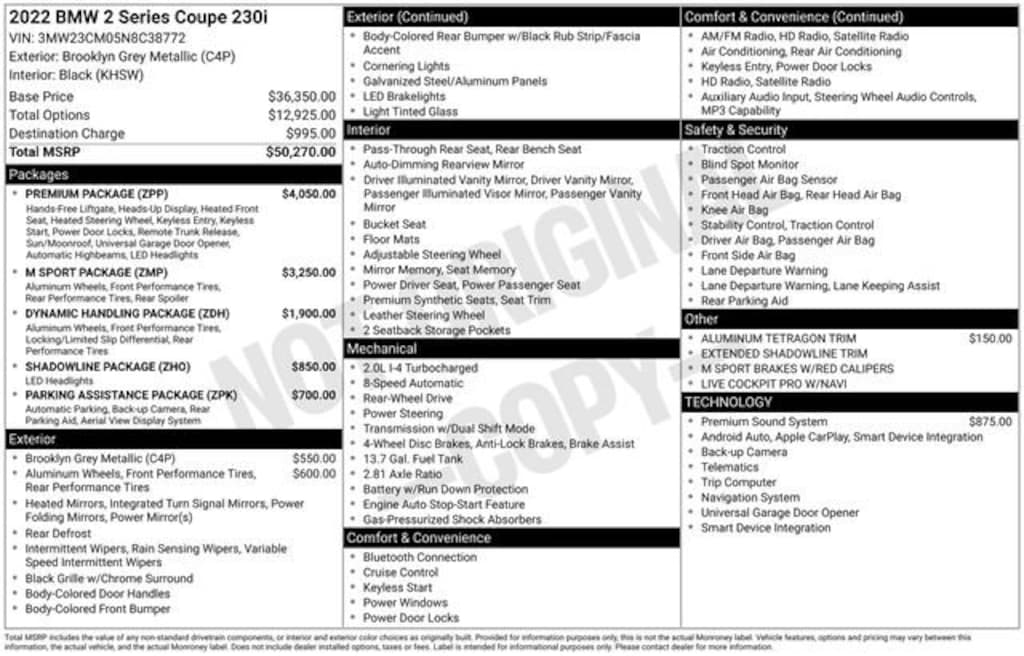Elevate Your Driving Experience with the Exceptional 2022 BMW 2 Series 230iDiscover the perfect blend of performance, style, and sophistication in the 2022 BMW 2 Series 230i. This remarkable vehicle is a true testament to BMW's commitment to engineering excellence, offering a driving experience that will captivate and inspire you.- Apple CarPlay/Android Auto- Bluetooth- CARBRAVO CERTIFIED- Satellite Radio- Service Contract Available- WHEELS: 19 X 8.0 FR & 19 X 8.5 RR (STYLE 791M)- HARMAN/KARDON SURROUND SOUND SYSTEM- DYNAMIC HANDLING PACKAGE- SHADOWLINE PACKAGE- M SPORT PACKAGE- PARKING ASSISTANCE PACKAGE- PREMIUM PACKAGE (DISC)Powered by a potent 2.0L I4 16V TwinPower Turbo engine mated to an 8-Speed Automatic Sport transmission, the 2022 BMW 2 Series 230i delivers an exhilarating performance that will leave you craving the open road. With a remarkable 26 MPG in the city and 35 MPG on the highway, this vehicle combines power and efficiency for a truly rewarding driving experience.The exterior of the 2022 BMW 2 Series 230i is a stunning display of the brand's iconic design language. The Gray finish, complemented by the dynamic Aerodynamic Kit and Shadowline Exterior Trim, creates a bold and sophisticated look that will turn heads wherever you go. The 19-inch M double-spoke bi-color wheels add a touch of sportiness, while the M Sport Brakes with Blue Calipers provide exceptional stopping power.Step inside the 2022 BMW 2 Series 230i, and you'll be greeted by a cabin that exudes luxury and attention to detail. The Perforated SensaTec Upholstery and Power Front Seats with Memory provide unparalleled comfort, while the Heated Steering Wheel and Heated Front Seats ensure you stay cozy in any weather. The Live Cockpit Pro with Navigation and Head-Up Display keep you informed and connected, while the Harman/Kardon Surround Sound System delivers an immersive audio experience.Experience the true essence of driving pleasure with the 2022 BMW 2 Series 230i. This exceptional vehicle is a testament to BMW's commitment to crafting vehicles that inspire and captivate. Visit our showroom today and let us demonstrate why the 2022 BMW 2 Series 230i should be your next luxury sports car.