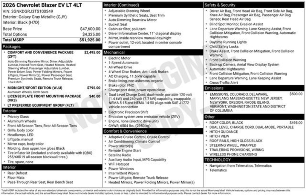 Schumacher Chevrolet of Boonton is honored to offer this fantastic 2026 Chevrolet Blazer EV LT in Galaxy Gray Metallic Beautifully equipped with Comfort & Convenience Package (2-Way Front Passenger Power Lumbar Seat Adjuster, 2-Way Power Driver Lumbar Seat Adjuster, 6-Way Power Front Passenger Seat Adjuster, 8-Way Power Driver Seat Adjuster, Evotex Seat Trim, Heated Driver & Fr Passenger Seats Cushion & Seatback, Heated Steering Wheel, Hitch Guidance, Hitch View, Inside Rear-View Auto-Dimming Mirror, Power-Adjustable Power-Folding Heated Mirrors, Programmable Hands Free AutoSense Power Liftgate, Wireless Phone Charging, and Wrapped Steering Wheel), Midnight/Sport Edition (High Gloss Black Roof Rails and Wheels: 19 Black Aluminum), Preferred Equipment Group 4LT, 4-Wheel Disc Brakes, 6 Speakers, 6-Speaker Audio System Feature, 6-Way Manual Driver Seat Adjuster, 6-Way Manual Front Passenger Seat Adjuster, ABS brakes, Air Conditioning, Alloy wheels, AM/FM radio: SiriusXM with 360L, Auto High-beam Headlights, Automatic temperature control, Black Roof, Brake assist, Bumpers: body-color, Cloth Seat Trim, Compass, Delay-off headlights, Driver door bin, Driver vanity mirror, Dual front impact airbags, Dual front side impact airbags, Electronic Stability Control, Emergency communication system: OnStar and Chevrolet connected services capable, Four wheel independent suspension, Front anti-roll bar, Front Bucket Seats, Front Center Armrest, Front reading lights, Fully automatic headlights, Illuminated entry, Knee airbag, Low tire pressure warning, Navigation System, Occupant sensing airbag, Outside temperature display, Overhead airbag, Overhead console, Panic alarm, Passenger door bin, Passenger vanity mirror, Power door mirrors, Power steering, Power windows, Radio: 17.7 Diagonal Advanced Color LCD Display, Rear anti-roll bar, Rear reading lights, Rear seat center armrest, Rear window defroster, Rear window wiper, Remote keyless entry, Ride & Handling Suspension, Security system, SiriusXM w/360L Trial Subscription, Speed control, Split folding rear seat, Spoiler, Steering wheel mounted audio controls, Telescoping steering wheel, Tilt steering wheel, Traction control, Trip computer, Variably intermittent wipers, and Wheels: 19 Machined-Face Aluminum! Price includes: $1000 - Customer Cash. Exp. 11/03/2025 $750 - Purchase Allowance for Current Eligible Non-GM Owners and Lessees. Exp. 11/03/2025