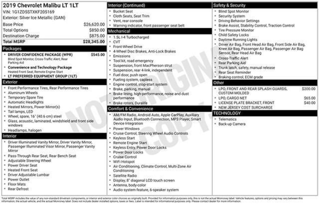 Silver Ice Metallic 2019 Chevrolet Malibu LT 4D Sedan FWD CVT 1.5L DOHC 29/36 City/Highway MPG