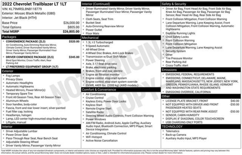 Mosaic Black Metallic 2022 Chevrolet TrailBlazer LT 4D Sport Utility AWD 9-Speed Automatic 1.3L Ecotec Turbo DOHC SIDI w/VVT 26/30 City/Highway MPG