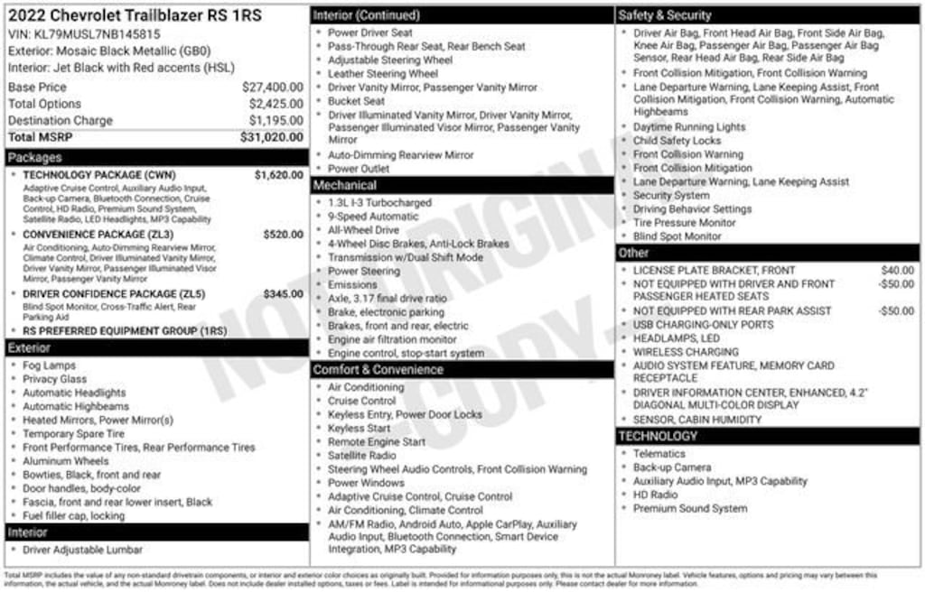 Adaptive Cruise Control, Bluetooth, Back Up Camera, Blind Spot Monitor, Cross Traffic Alert, Apple Car Play/Android Auto, Service Contract Available!, Heated Seats, 1 Type-A & 1 Type-C USB Charging-Only Ports, 120-Volt Power Outlet, 4.2 Diagonal Multi-Color Driver Info Center, 8 Diagonal Color Touchscreen Display, Adaptive Cruise Control, Auto High-beam Headlights, Bose Premium 7-Speaker Audio System Feature, Convenience Package, Driver & Front Passenger Illuminated Vanity Mirrors, Driver Confidence Package, Front fog lights, Fully automatic headlights, HD Radio, HD Rear Vision Camera, Heated Steering Wheel, Inside Rear-View Auto-Dimming Mirror, Lane Change Alert w/Side Blind Zone Alert, LED Headlamps, Power driver seat, Preferred Equipment Group 1RS, Radio: Chevrolet Infotainment 3 Plus System, Rear Cross Traffic Alert, Rear Park Assist, Single-Zone Auto Climate Control Air Conditioning, Technology Package, Wheels: 18 High Gloss Black Machined Aluminum, Wireless Charging.